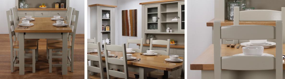 The French-inspired Bordeaux range of two-tone painted dining furniture has an elegant yet relaxed, rustic style. Beautiful rich oak veneers show off the natural grain of the wood. The furniture is finished with care, with dovetailed joints on the drawers and a 'reciprocal action' sliding top on the dining table extending it to seat 8-10 people with ease.